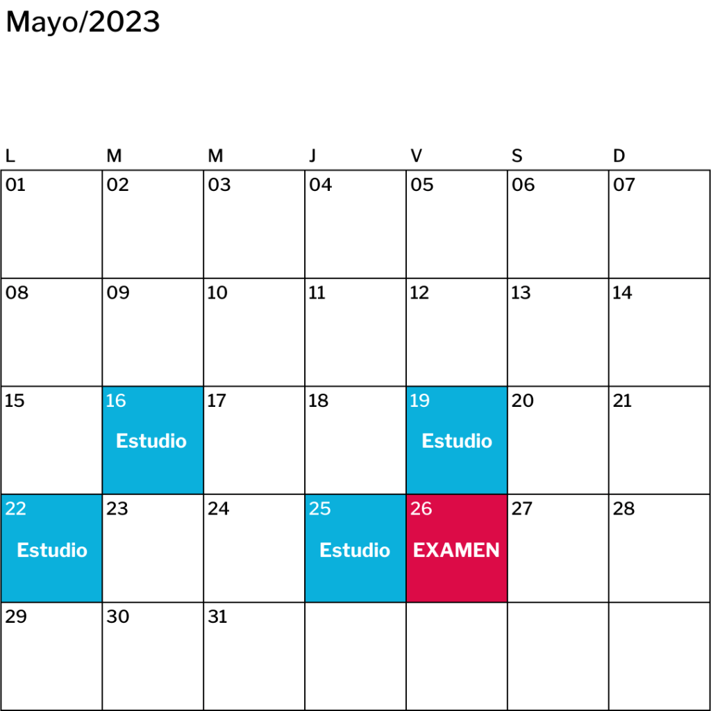 Por ejemplo, si tienes una prueba dentro 2 semanas, asigna 4 sesiones y deja un intervalo de varios días entre cada una de ellas.