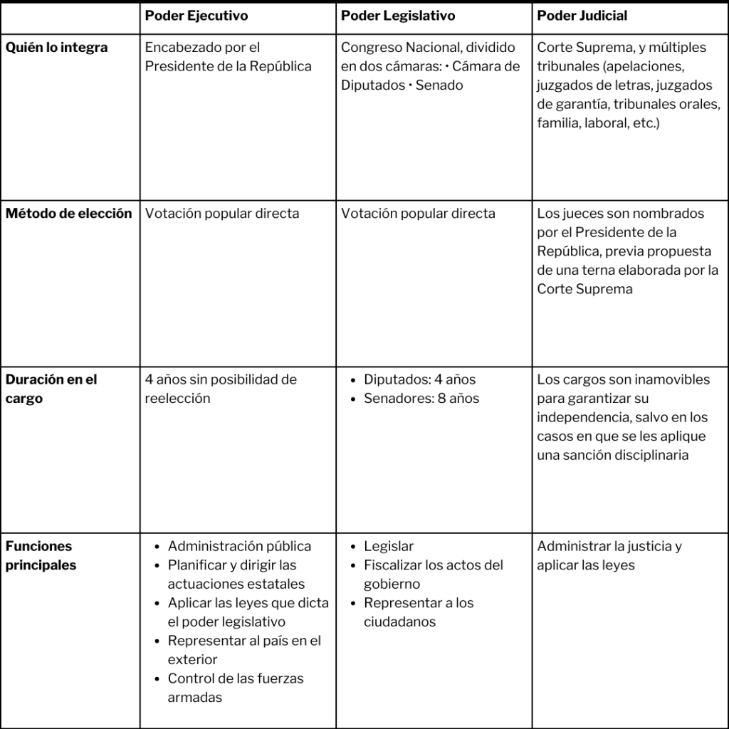 En Chile, el Estado está compuesto por tres poderes: el Ejecutivo, el Legislativo y el Judicial.